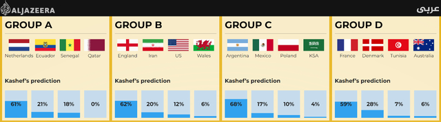 根据预测,A组中最可能出线是荷兰队,可能性61%,其次是厄瓜多尔,可能性21%;B组中是英格兰队和伊朗队,可能性分别为62%和20%;C组中是阿根廷队和墨西哥队,可能性分别为68%和17%;D组是法国队和丹麦队,可能性分别为59%和28%。