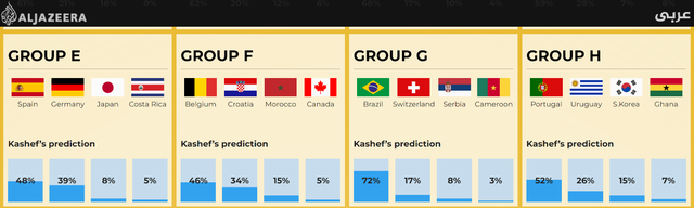 E组中最可能的获胜者是西班牙队,可能性48%,同时德国队获胜的可能性也有39%;F组中是比利时队,可能性46%,克罗地亚队获胜可能性也有34%;G组中是巴西队,可能性高达72%,其次瑞士队获胜可能性17%;H组中是葡萄牙队和乌拉圭队,可能性分别为52%和26%。