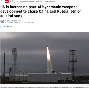 美国有线电视新闻网的报道援引沃尔夫的话称,在中俄先于美国拥有高超等前沿武器系统的背景下,美军于上个月进行了两次高超音速武器系统的试射,以收集热防护材料、高端电子器件、超轻复合材料等高超音速武器材料以及元器件实验数据,所有这些实验都是成功开发和部署高超音速武器的必经环节。