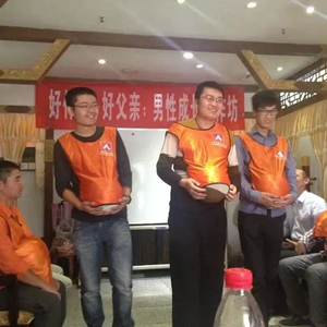 ▲2015年举办的“男德班”中,学员们体验孕妇的辛苦。受访者供图