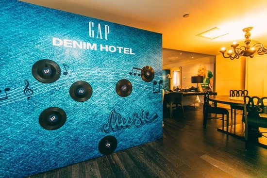 比如2018年,服装品牌GAP在上海推出了快闪舒适牛仔酒店,GAP用满满的牛仔元素将它对与“舒适”的理解传递给消费者。整个酒店充满了牛仔元素,带有GAP Logo的房间门卡、廊海报、房间指引牌、酒店立柱等等。