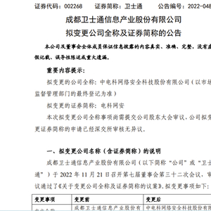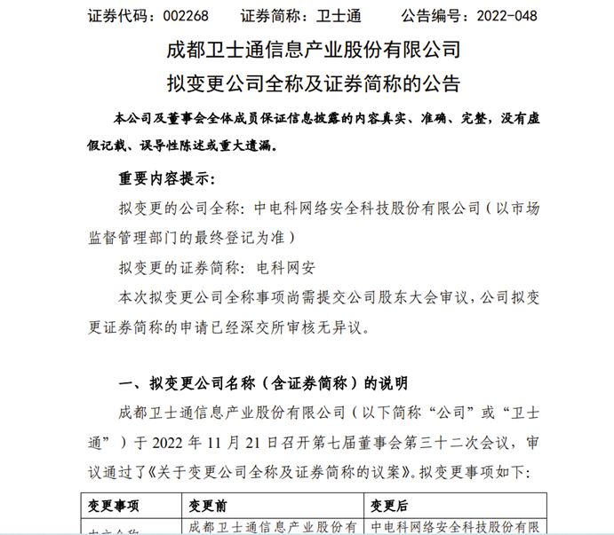 11月21日晚间,卫士通(002268)发布公告称,公司拟变更公司全称为“中电科网络安全科技股份有限公司”,证券简称变更为“电科网安”。