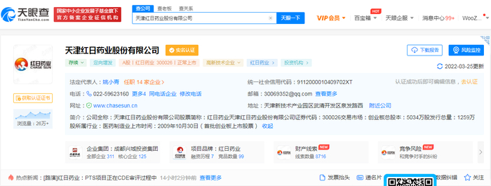 天眼查信息显示,作为首批创业板上市公司,红日药业于2009年10月30日登陆深交所。公司以“传承发展中华医药,解决人类健康难题”为愿景,以研发精药、生产良药为己任,专注重症领域、肿瘤及免疫、心脑血管、呼吸系统、神经退行性疾病领域的研究与创新,目前已发展成为横跨成品药、中药配方颗粒、原辅料、医疗器械、医疗健康服务、药械智慧供应链等诸多领域,集投融资、研发、生产、销售于一体的高科技医药健康产业集群。