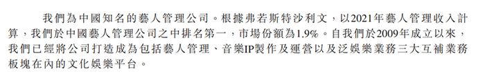 根据招股书,乐华娱乐的主营业务包括艺人管理、音乐IP制作及运营、泛娱乐业务三个板块。资料显示,以2021年艺人管理收入计算,乐华娱乐在中国艺人管理公司中排名第一,市场份额为1.9%。