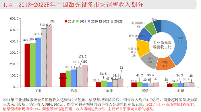 激光设备是一种“工业母机”,应用领域包括工业、信息、医疗等,目前工业应用占比超60%。