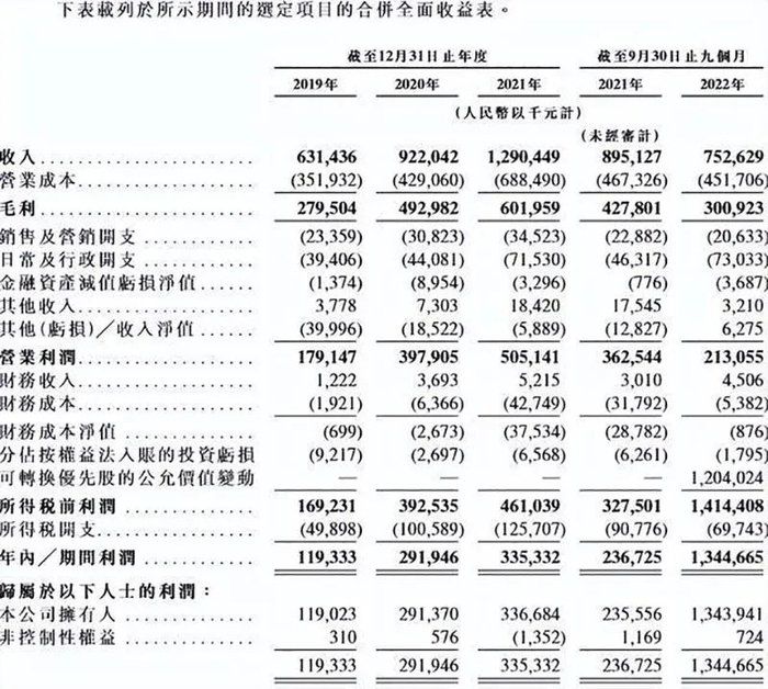 根据最新版招股书,乐华娱乐近三年业绩高速增长。2019-2021年,乐华娱乐的收入分别为6.31亿元、9.22亿元、12.9亿元;净利润分别约为1.19亿元、2.92亿元、3.35亿元。2022年前三季度,乐华娱乐总营收为7.53亿元,同比下滑15.9%。