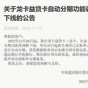 日前,建设银行发布公告,自2022年12月30日起,该行龙卡益贷卡(金卡、白金卡)自动分期功能将调整下线,即自该日起新生成的已出账单,将不再进行自动分期,客户需根据账单列示金额合理安排还款。