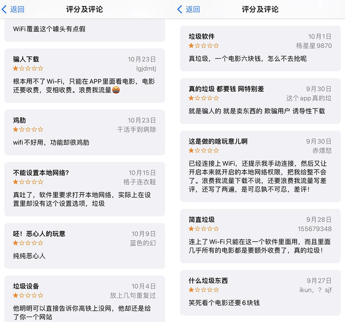 在应用商店中,也有大量用户在“掌上高铁”APP下方评论高铁WiFi无法使用。“他明明可以直接告诉你高铁上没网,却还是给了你一个网站”,有用户如此评论。
