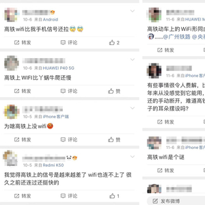 不过就乘客的反馈来看,最近高铁WiFi的效果不尽人意,并且已持续较长时间。在社交平台上,不少乘客抱怨高铁WiFi连接不上,或者连接上了无法使用,有乘客写道“高铁动车上的WiFi形同虚设,没有成功连接过一次”。