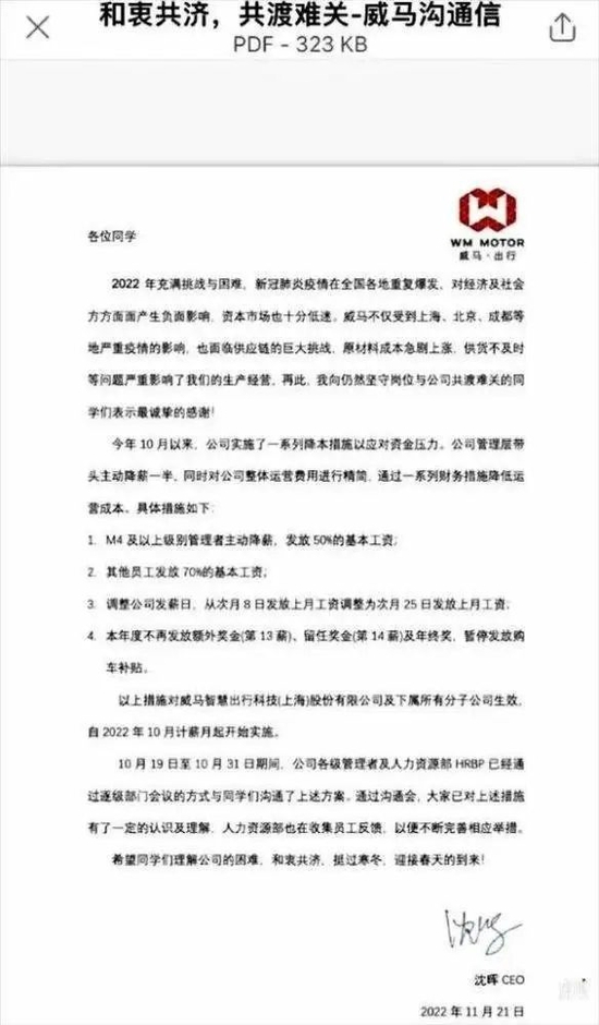 11月21日,网上流出了一份威马汽车CEO沈晖发布的内部信,透露了威马正在执行的整体降薪计划。