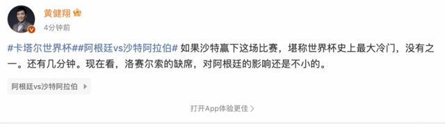 而在比赛补时阶段,体育评论员黄健翔发文称,如果沙特赢下这场比赛,堪称世界杯史上最大冷门,没有之一。还有几分钟。现在看来,洛赛尔索的缺席,对阿根廷的影响还是不小的。