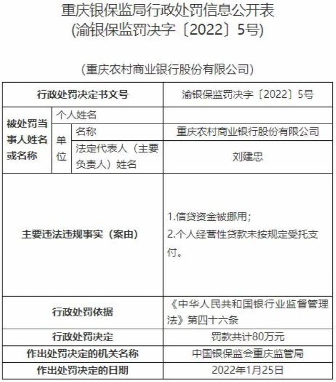 另外,今年1月,重庆农商行因信贷资金被挪用、个人经营性贷款未按规定受托支付两宗违法违规,被重庆银保监局处以80万元的罚款。