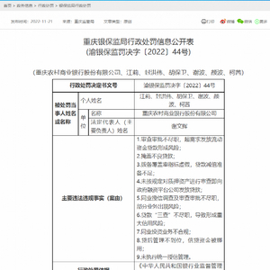 此次与重庆农商行一同受罚的,还有6名自然人。重庆银保监局对江莉、封洪伟、胡保卫、柯茜警告,对谢波警告并罚款5万元,对颜波警告并罚款5万元。
