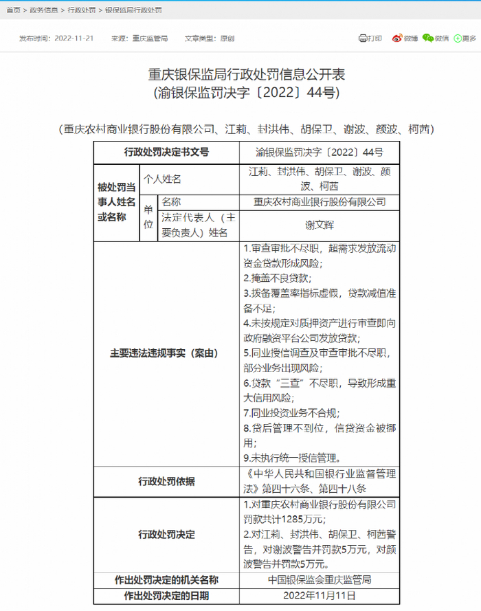 依据《银行业监督管理法》相关规定,重庆银保监局于2022年11月11日对重庆农商行罚款共计1285万元。