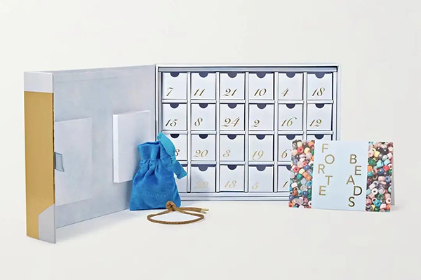 Carolina Bucci是珠宝设计师Carolina Bucci创立的同名珠宝品牌,作品都有着大胆的配色和独特的设计。此次的倒数日历共有24格,每天可以开启一个小格子收集两颗首饰串珠,所有串珠都是由不同的宝石手工雕琢而成的。其中除了有小众、高颜值的天使石、天河石、蔷薇辉石,还有象征吉祥、和气的绿松石,还有被尊为“爱的守护石”的紫水晶等多种珠宝。