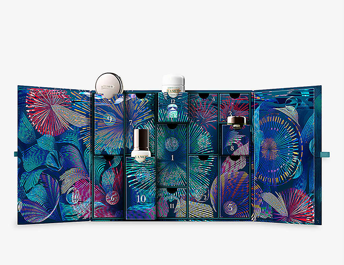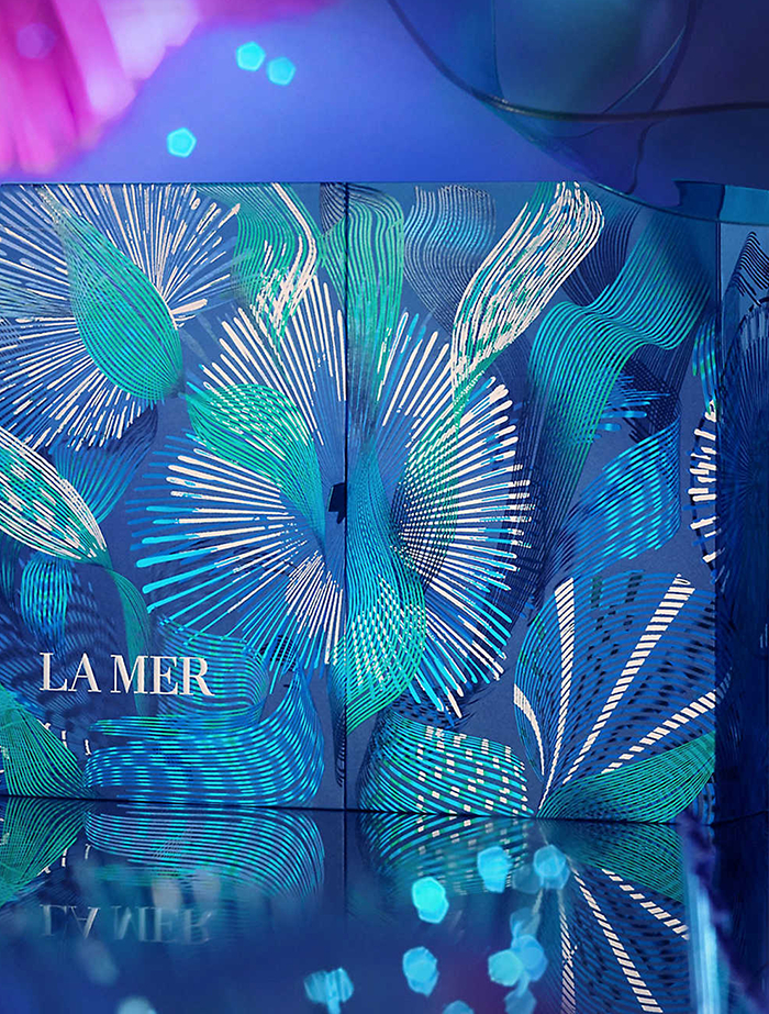 今年La Mer推出的节日季蓝紫色羽毛烟花礼盒华丽又梦幻,12个倒数格子里藏满了经典好物,包含修复精华油、保湿精华、面霜、眼霜、面膜和一个正装明星润唇膏等明星单品。