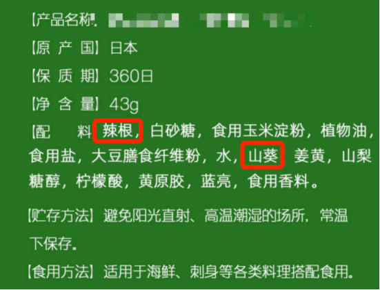 所以,你在网上买山葵酱的时候,需要注意看一下配料表,买来的到底是山葵酱还是辣根酱。比如,下图的产品里,辣根在配料表第一,山葵在靠后的位置,说明主要成分是辣根而不是山葵。