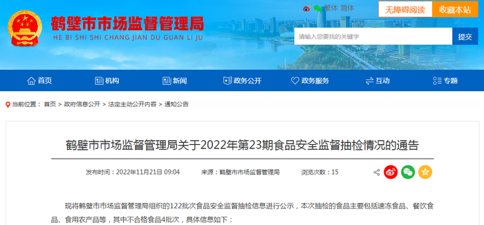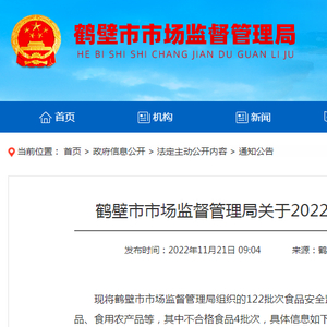 中国质量新闻网讯 2022年11月21日,河南省鹤壁市市场监督管理局网站发布关于2022年第23期食品安全监督抽检情况的通告。