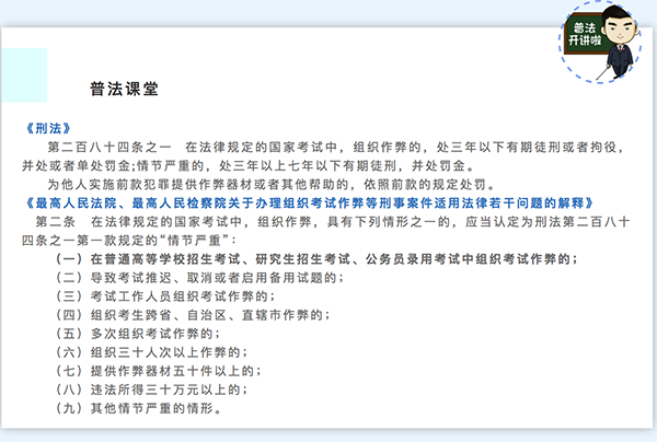 《刑法》第二百八十四条之一 规定:在法律规定的国家考试中,组织作弊的,处三年以下有期徒刑或者拘役,并处或者单处罚金;情节严重的,处三年以上七年以下有期徒刑,并处罚金。