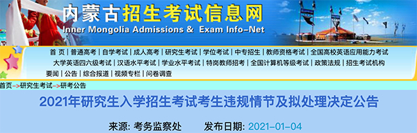 2021年初,内蒙古自治区教育招生考试中心、浙江省教育考试院两地曾发布研考考生考试违规拟处理公告。