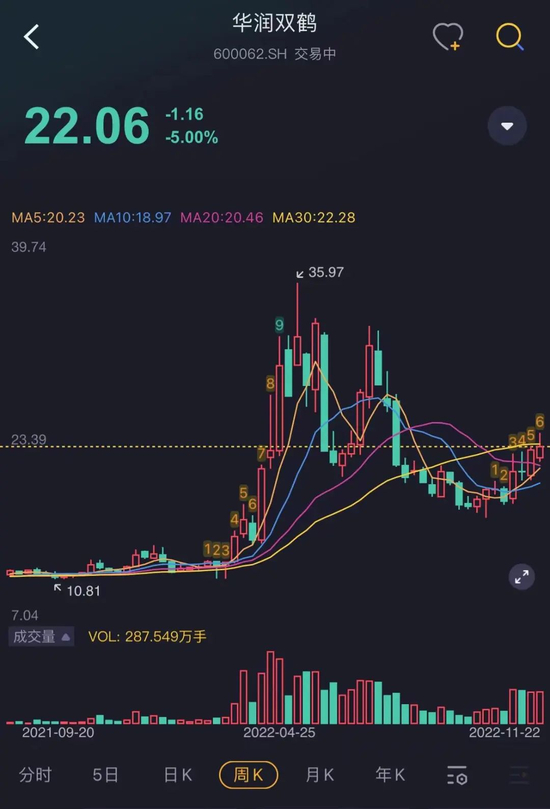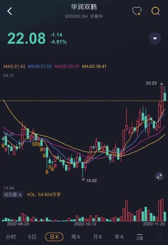 而A股的华润双鹤(600062.SH)就是真实生物的受托生产商,最近股价也跟新冠药行情而大涨。但随着药品下架的消息,截止今日午间,公司股价下跌约4%。