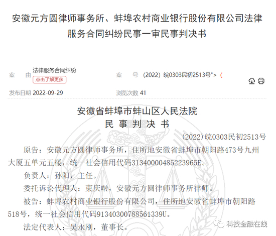 值得一提的是,就在近期,蚌埠市蚌山区法院还公布了一则关于蚌埠农商行和一家律师事务所之间民事纠纷的一审判决书。