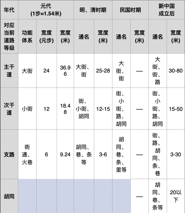 一般来说,北京老城道路通名按照宽度由大到小分别为:大街、街、小街、路、巷、胡同、条等。该体系形成于元大都时期,经明清两代逐渐演变成熟,民国时期及建国后又随着城市现代化建设进行了适当调整(详见表格)。
