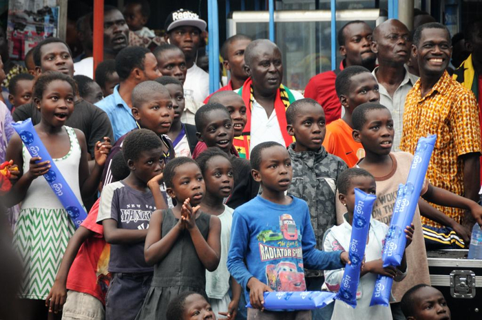 ↑2014年巴西世界杯,加纳球迷聚集在首都的商业街大屏幕前观看比赛。
