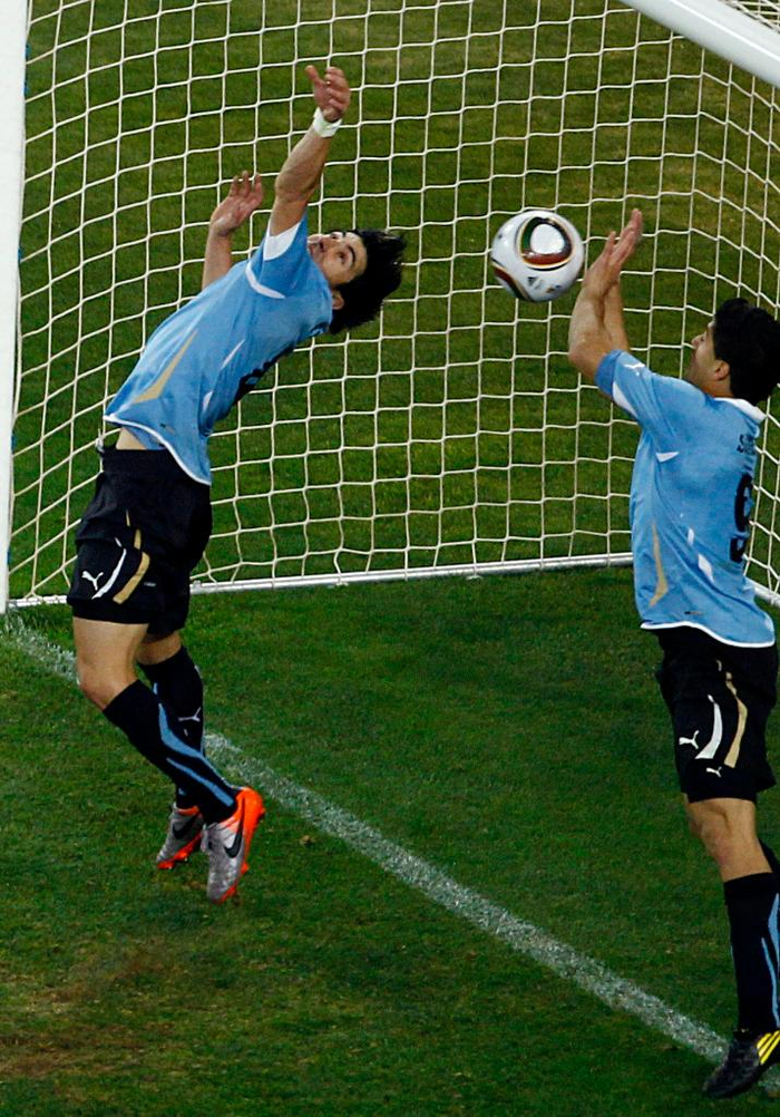 ↑2010年南非世界杯四分之一决赛,乌拉圭队球员苏亚雷斯(右)在加时赛最后一分钟在门前手球犯规,被红牌罚下。