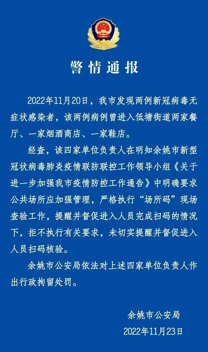 余姚公安发布消息,余姚市发现两例新冠病毒无症状感染者,这两例病例曾经进入两家餐厅、一家烟酒商店、一家鞋店,这四家单位均未严格执行“场所码”查验工作,警方对这四家单位负责人做出行政拘留处罚。另外,高新区一男子拒不佩戴口罩并辱骂防疫工作人员,警方依法对其予以行政处罚。