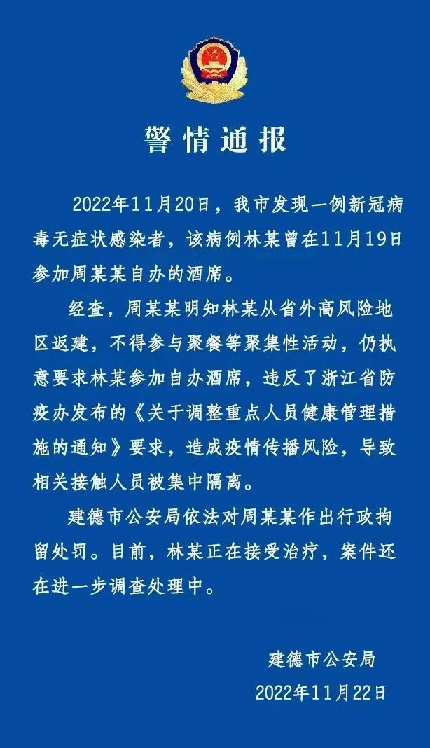 杭州一人执意要求从省外高风险地区返回人员参加自办酒席,造成疫情传播风险,被拘留