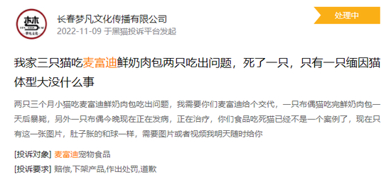 黑猫投诉平台上,有关“麦富迪”的投诉有169起,比如用户投诉: