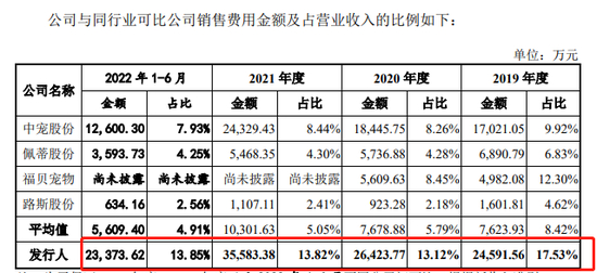 报告期内的三年半时间,乖宝宠物销售费用分别为 2.46亿元、2.64亿元、3.56亿元和2.34亿元,合计11亿元,占各期营业收入的比例分别为 17.53%、13.12%、13.82%和13.85%。