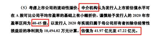 申请文件还显示,中介机构根据A 股可比公司平均市盈率,给予乖宝宠物的2020 年市盈率区间为40-45倍,以乖宝宠物2020年实现归母扣非净利润10494.02万元计算,估值为41.97亿元至47.22亿元。