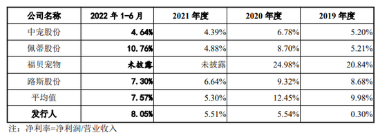 与同行可比公司来看,2019年至2020年,乖宝宠物明显低于同行平均值,2021年与同行相当。2022 年上半年略高于同行业平均,乖宝宠物称因销售毛利率上升,期间费用率下降。