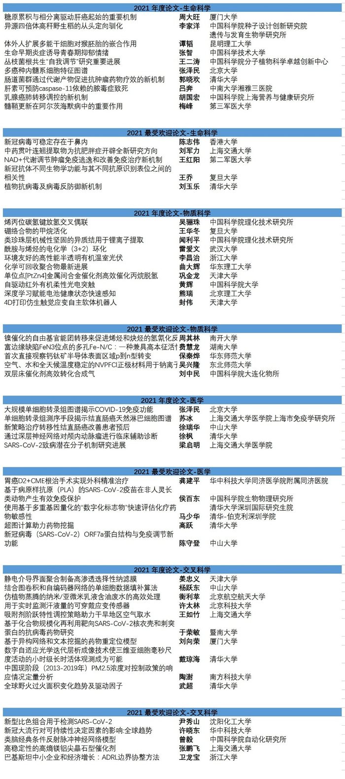 本届活动评选出生命科学、物质科学、医学及交叉科学四个领域“2021中国年度论文”共35篇(生命科学、物质科学和交叉科学领域各10篇,医学5篇);另经网友投票,评出“2021年Cell Press最受欢迎中国论文”共20篇(每个领域5篇)。