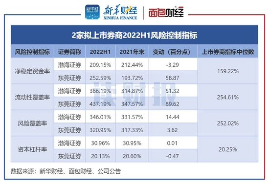 与目前41家上市券商的中位数相比,东莞证券和渤海证券的核心风险控制指标普遍高于中位数水平,仅东莞证券的资本杠杆率略低于上市券商中位数20.25%。