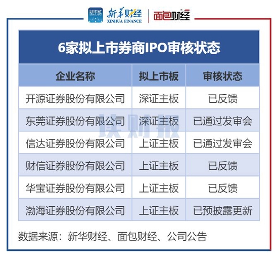 除首创证券外,目前仍有6家券商正在申请上市。其中,信达证券、东莞证券2家审核状态为已通过发审会,开源证券、财信证券、华宝证券3家审核状态为已反馈,渤海证券审核状态为已预披露更新。