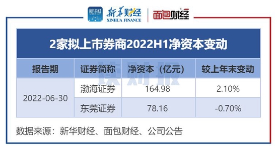 以上6家拟上市券商仅有2家披露了2022年中报净资本数据。截至2022年6月末,渤海证券、东莞证券净资本分别为164.98亿元、78.16亿元,较上年末分别变动2.10%、-0.70%。