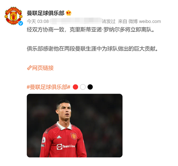 曼联官方同时宣布,俱乐部感谢C罗在两次效力曼联期间为俱乐部做出的贡献。目前C罗正在跟随葡萄牙国家队备战卡塔尔世界杯的比赛。