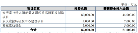 公司原拟募集资金5.10亿元,用于安庆索拉特太阳能装备用轻质高透面板制造项目、安庆索拉特研发中心建设项目、补充流动资金。