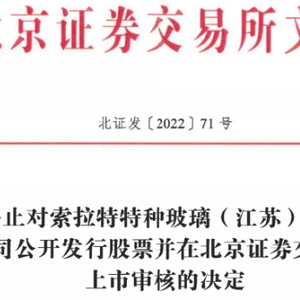 中国经济网北京11月23日讯据北交所网站消息,北交所披露关于终止对索拉特特种玻璃(江苏)股份有限公司(简称“索拉特”)公开发行股票并在北京证券交易所上市审核的决定。