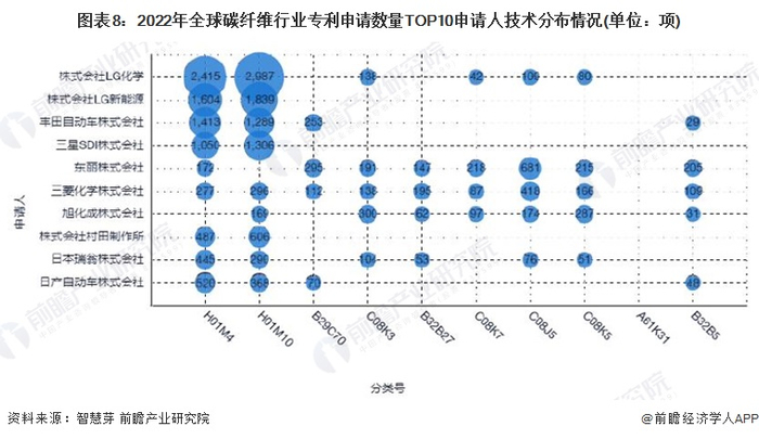 目前,全球碳纤维行业专利申请数量TOP10申请人技术主要布局在H01M10细分领域,其中全球碳纤维专利申请量TOP10申请人中,株式会社LG化学在该领域申请的专利数量最多,达到2987项。
