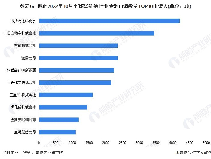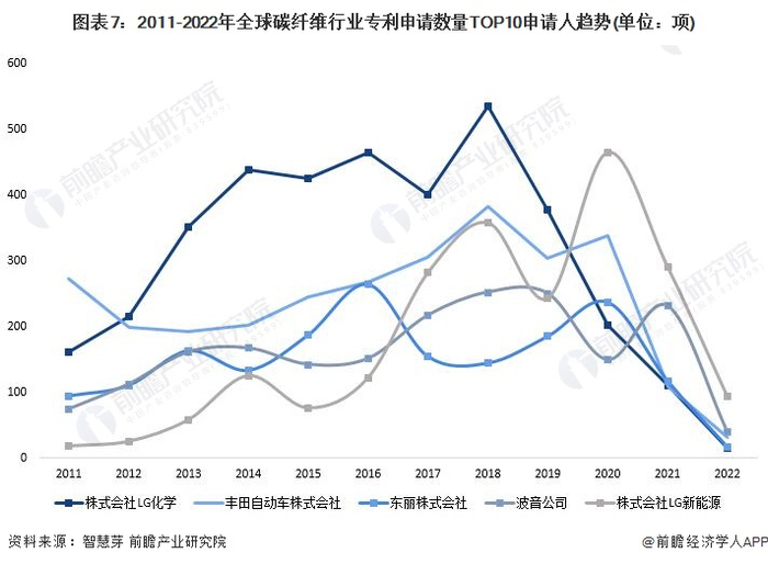全球碳纤维行业专利申请数量TOP10申请人分别是株式会社LG化学、丰田自动车株式会社、东丽株式会社、波音公司、株式会社LG新能源、三菱化学株式会社、三星SDI株式会社、旭化成株式会社、巴斯夫欧洲公司和宝马股份公司。
