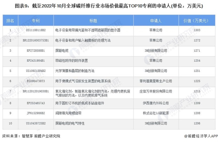 全球碳纤维市场价值最高TOP10专利中,苹果公司和3M创新有限公司各有3项专利。在市场价值TOP10专利中,苹果公司专利号为US11188118B2的专利价值最高,为1303万美元。