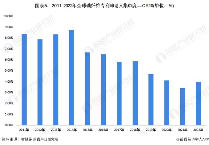 2011-2022年,全球碳纤维行业专利申请人CR10整体上呈下降的趋势,2021年下降至3.41%。整体来看,全球碳纤维行业专利申请人集中度较低。