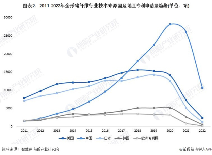 从趋势上看,2011-2017年,美国碳纤维专利申请数量处于领先地位。2018年开始,中国专利申请数量反超美国,之后保持领先位置。