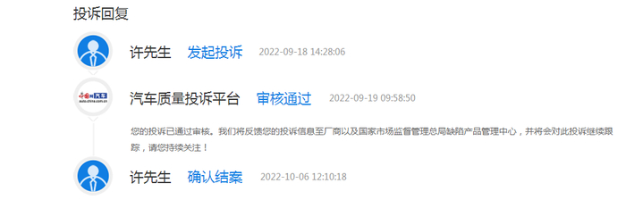 经过中国投诉-全国缺陷产品投诉平台与厂家及4s店沟通后,车主于10月6日得到厂家满意答复并选择结案。日前,记者对车主许先生进行电话回访,许先生表示,目前问题已得到妥善解决,4s店已将车机问题修好,后续也会对车辆进行持续观察,如果再出现问题,仍将第一时间到中国投诉-全国缺陷产品投诉平台进行反馈,同时也非常感谢平台的帮助。
