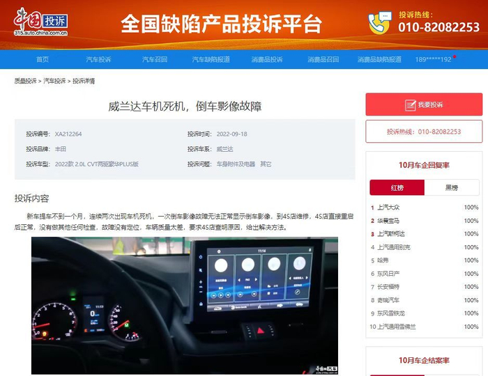 中国网汽车11月23日讯 今年9月中旬,广汽丰田威兰达车主许先生将他的车辆问题投诉至中国投诉-全国缺陷产品投诉平台,称“他的广汽丰田威兰达新车提车不到一个月,连续两次出现车机死机问题,出现一次倒车影像故障无法正常显示,到4S店维修检查,4S店直接重启,没有做其他任何检查,没有检查出具体故障原因”。 车主希望经过中国投诉-全国缺陷产品投诉平台调解能尽快解决问题,早日使自己的爱车恢复正常。