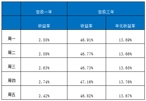 虽然,数据告诉我们,周四上涨概率较低,但是它对于定投“摊薄成本”的作用有多强?“疯狂星期四”真的有这么厉害吗?让我们再来看一组数据。